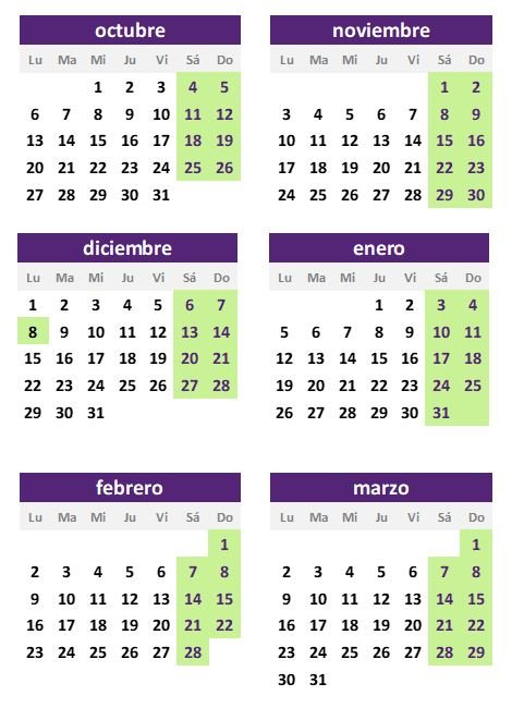 En este periodo se mantiene la apertura del club social durante los fines de semana y los festivos señalados con color verde en el calendario que aparece a continuación: